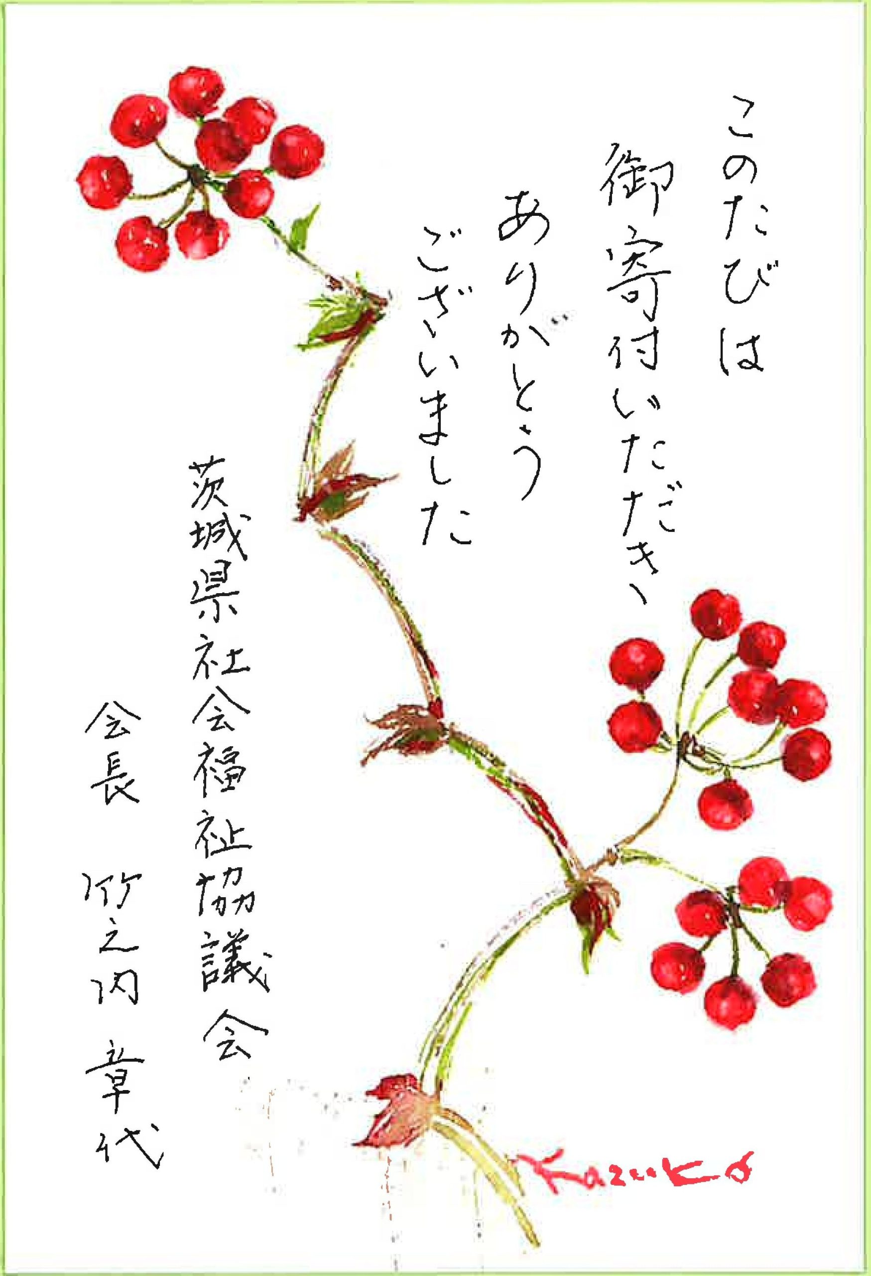 毎月、絵手紙の先生に、季節に合わせた素敵なお礼状を描いていただいております。