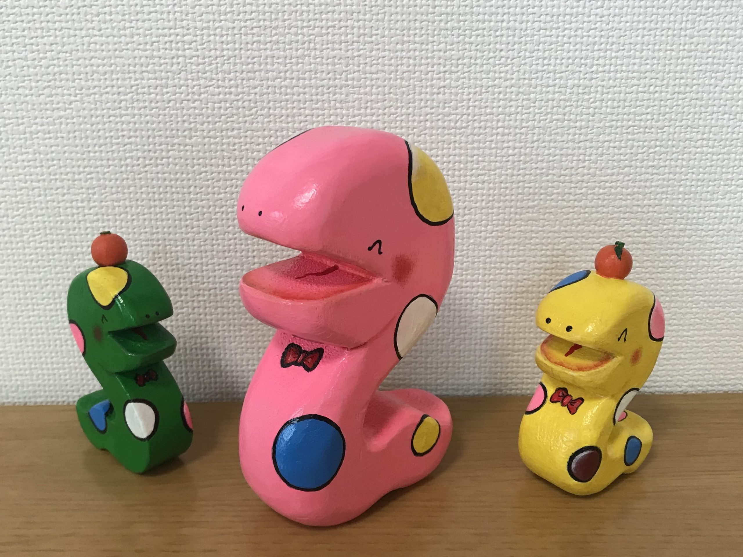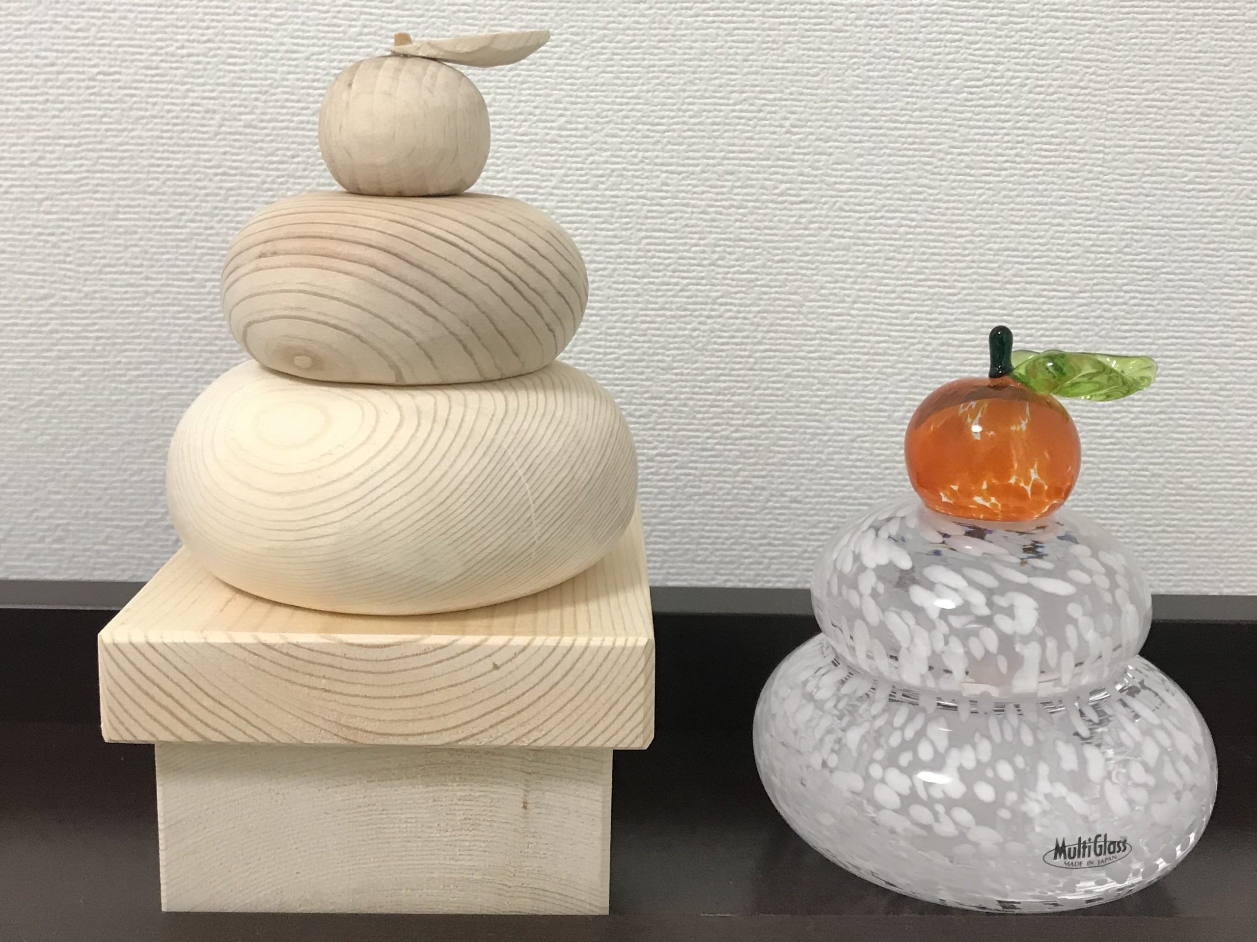 市販のガラス製鏡餅を参考にして木で作りました。
